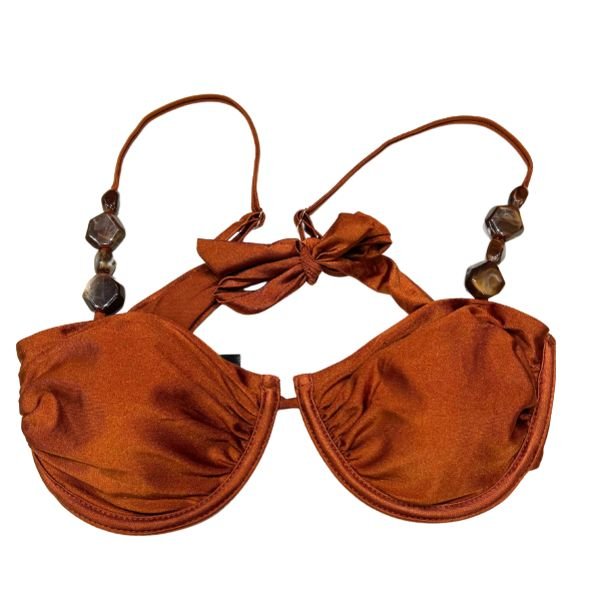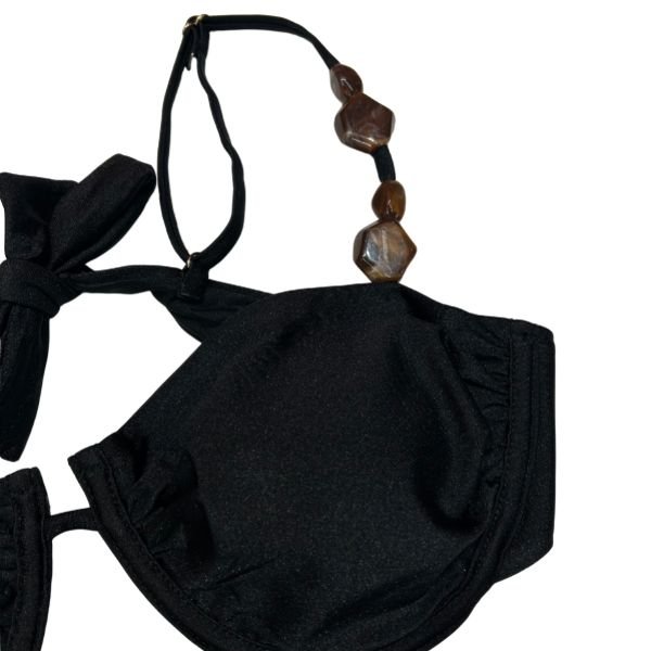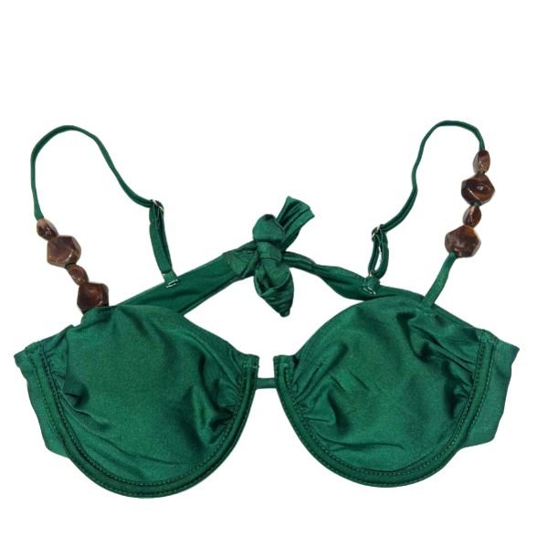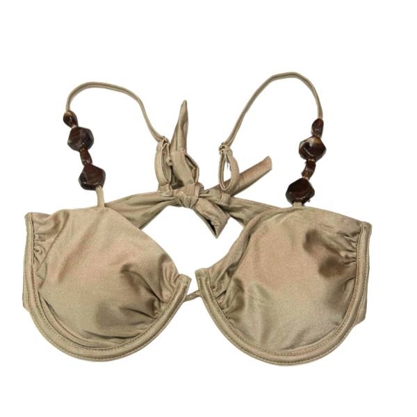 O biquíni oferece uma modelagem pensada no conforto e estilo. Seu modelo underwire com aro garante sustentação e realça o formato dos seios. As alças ajustáveis vêm adornadas com contas de madeira em tons naturais que adicionam charme e exclusividade. A parte superior se fecha com amarração, enquanto a calcinha está disponível em dois estilos: hot pant, para um visual moderno e confortável, ou fio-dental, para os amantes de cortes clássicos e sensuais.