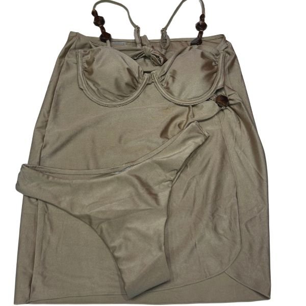 Prepare-se para momentos inesquecíveis com este conjunto de moda praia sofisticado e confortável. Feito com tecido de leve brilho na cor Fendi ou Cáqui Acetinado, o visual é chic e atemporal, perfeito para relaxar na piscina ou passear ao longo da praia. Este conjunto combina detalhes rústico-chiques e um toque artesanal, ideal para quem busca peças versáteis e elegantes.